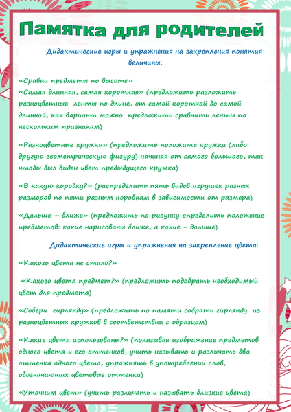Памятка для родителей "Игры и упражнения на закрепление понятия величины"